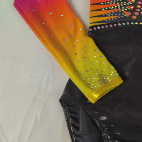 ✨ Justaucorps de gymnastique fille GLOW — Dégradé noir, jaune, orange & rose à Strass | Manches longues, éclat et confiance spropulseés par DAZZLE